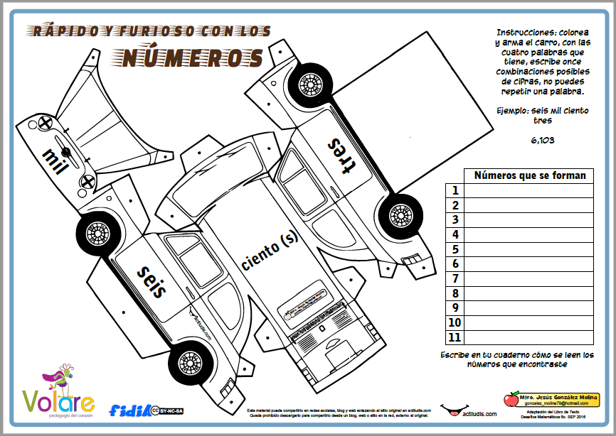 Instrucciones: colorea y arma el carro (coche), con las cuatro palabras que tiene, escribe once combinaciones posibles de cifras, no puedes repetir una palabra. Ejemplo: seis mil ciento tres 6,103