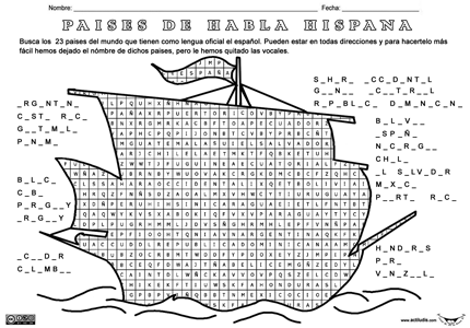 En la siguiente sopa de letras se encuentran ocultos 23 países que tienen como lengua oficial el español. Lo puedes encontrar en cualquier dirección, pero para hacerlo más fácil he añadido el nombre pero quitando las vocales.