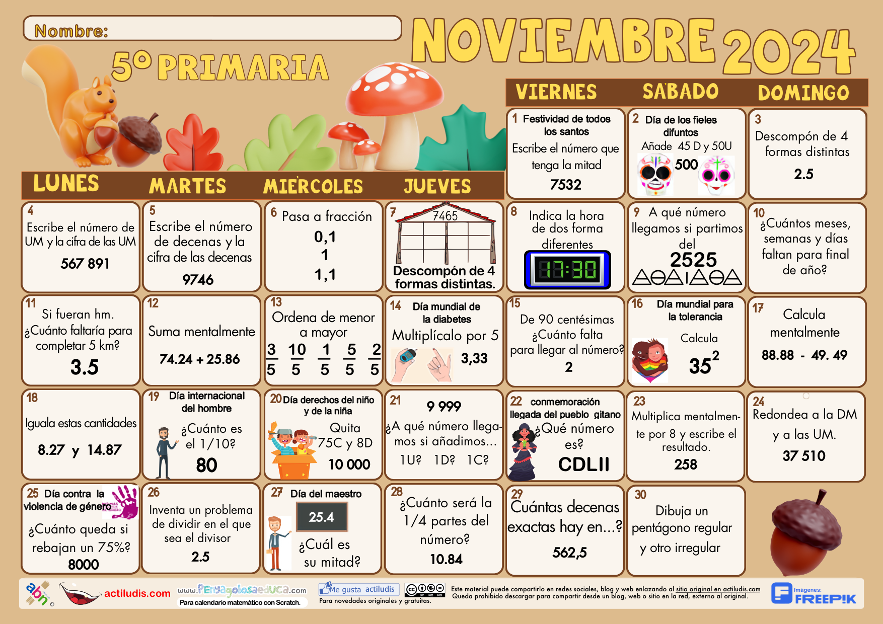 Calendario matemático para el TERCER CICLO de Primaria. NOVIEMBRE 2024