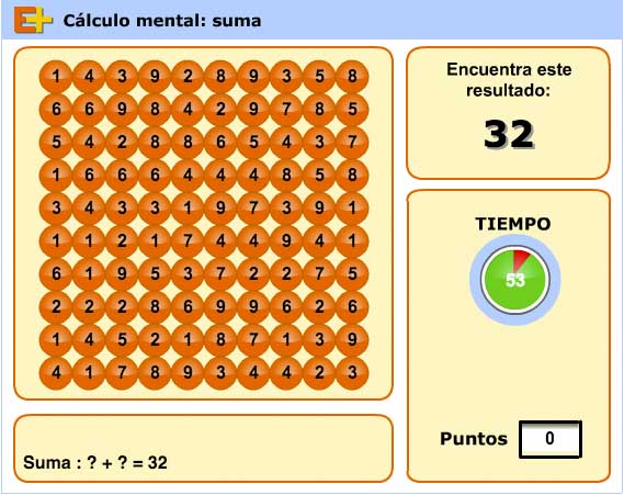 Con estas sencillas aplicaciones online desarrolladas por «Educaplus» podremos reforzar el cálculo mental básico para trabajar la suma, resta y el producto en las que debemos encontrar los números que operados den como resultado la cifra que muestra la pantalla dentro del tiempo establecido.