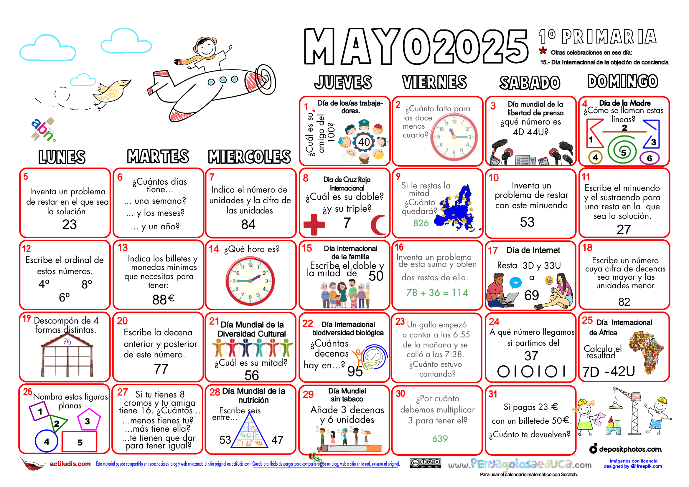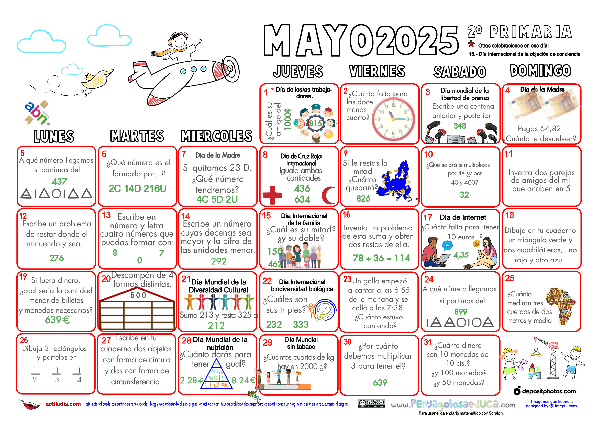 Calendario matemático para el PRIMER CICLO de Primaria. MAYO 2025
