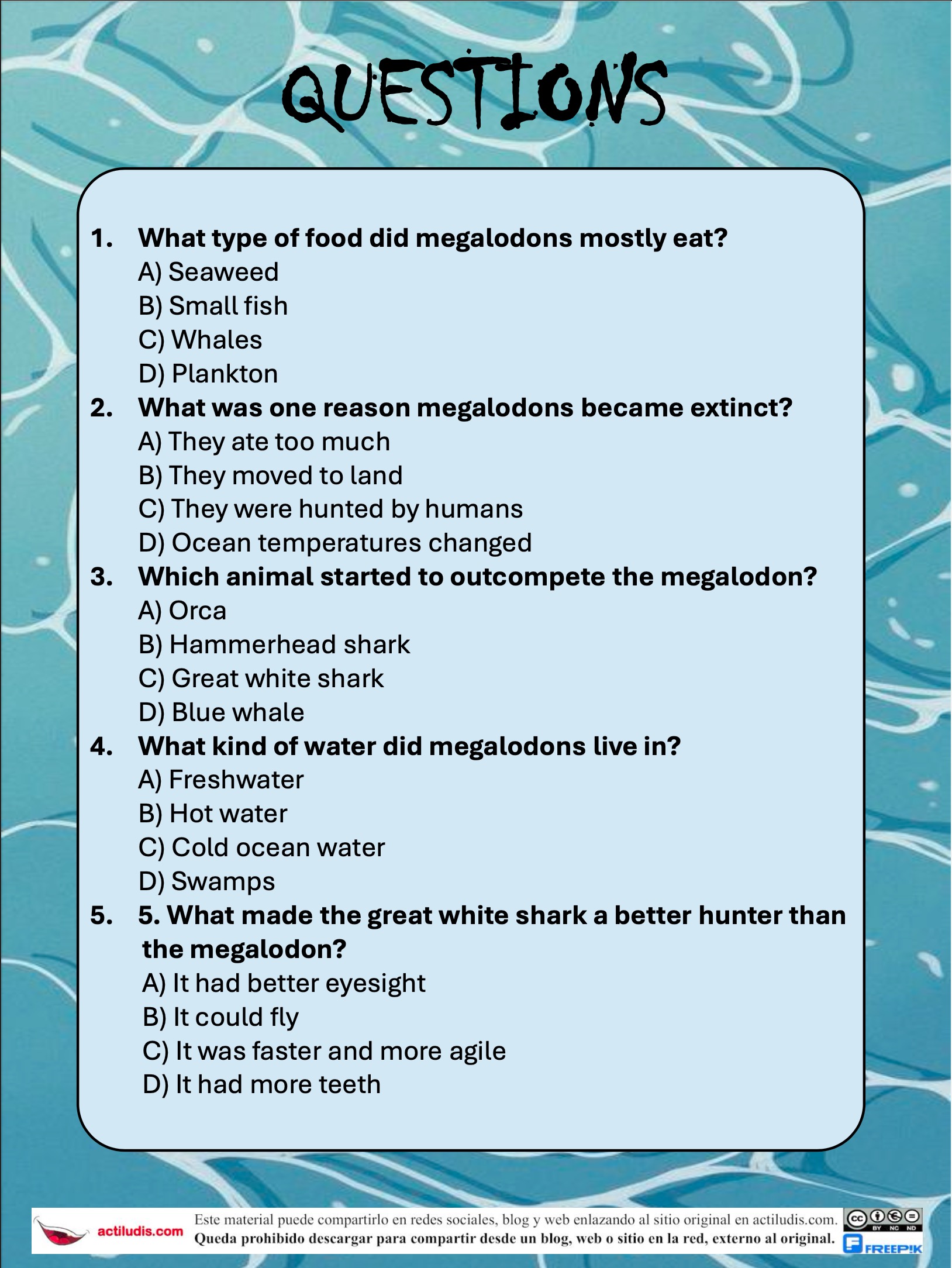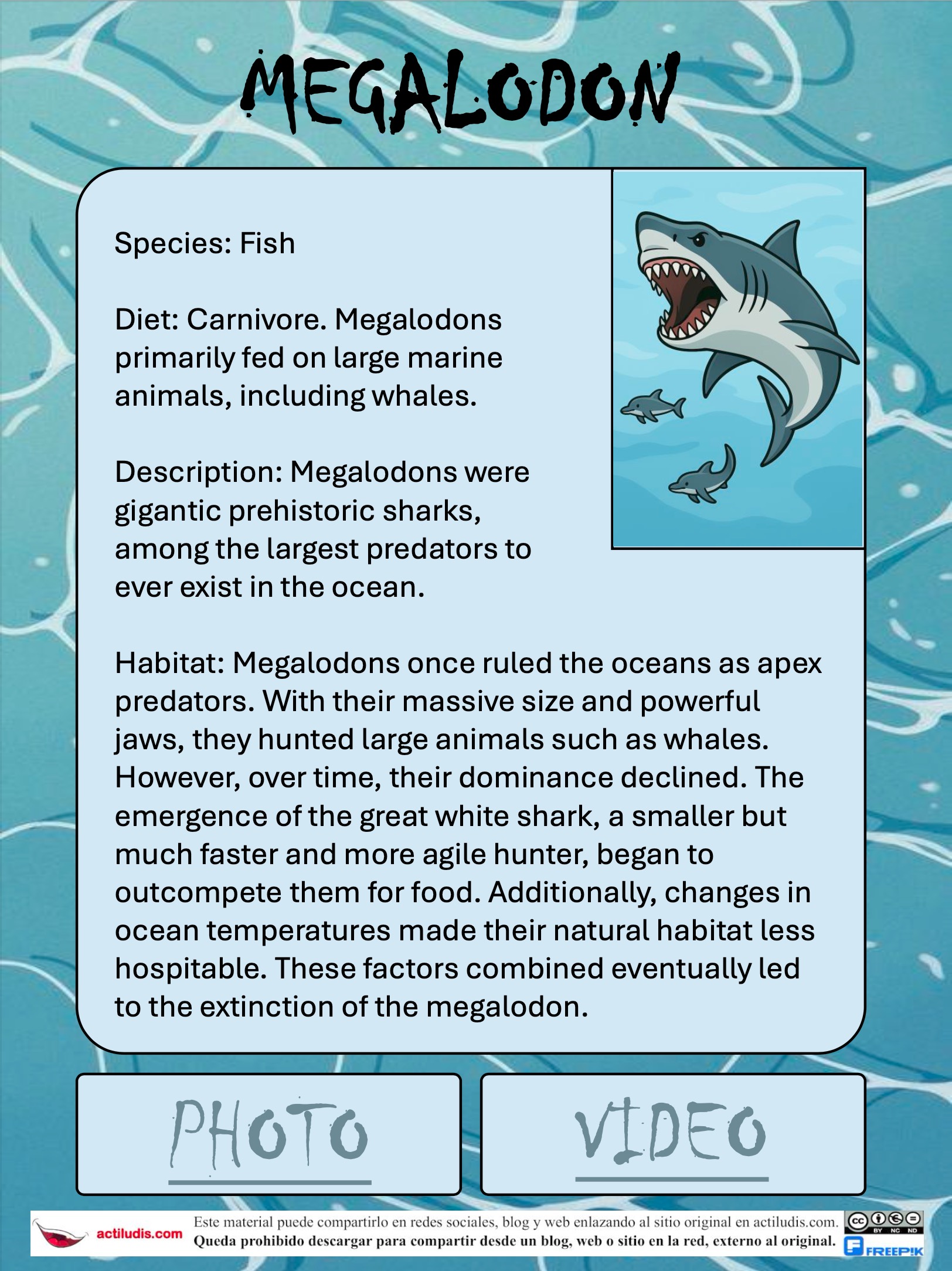 El texto en inglés que te presentamos nos adentra en el mundo de estos enormes tiburones: su alimentación, su hábitat, y las razones que llevaron a su extinción. También descubriremos cómo la aparición de otros cazadores, como el gran tiburón blanco, cambió el equilibrio marino para siempre.