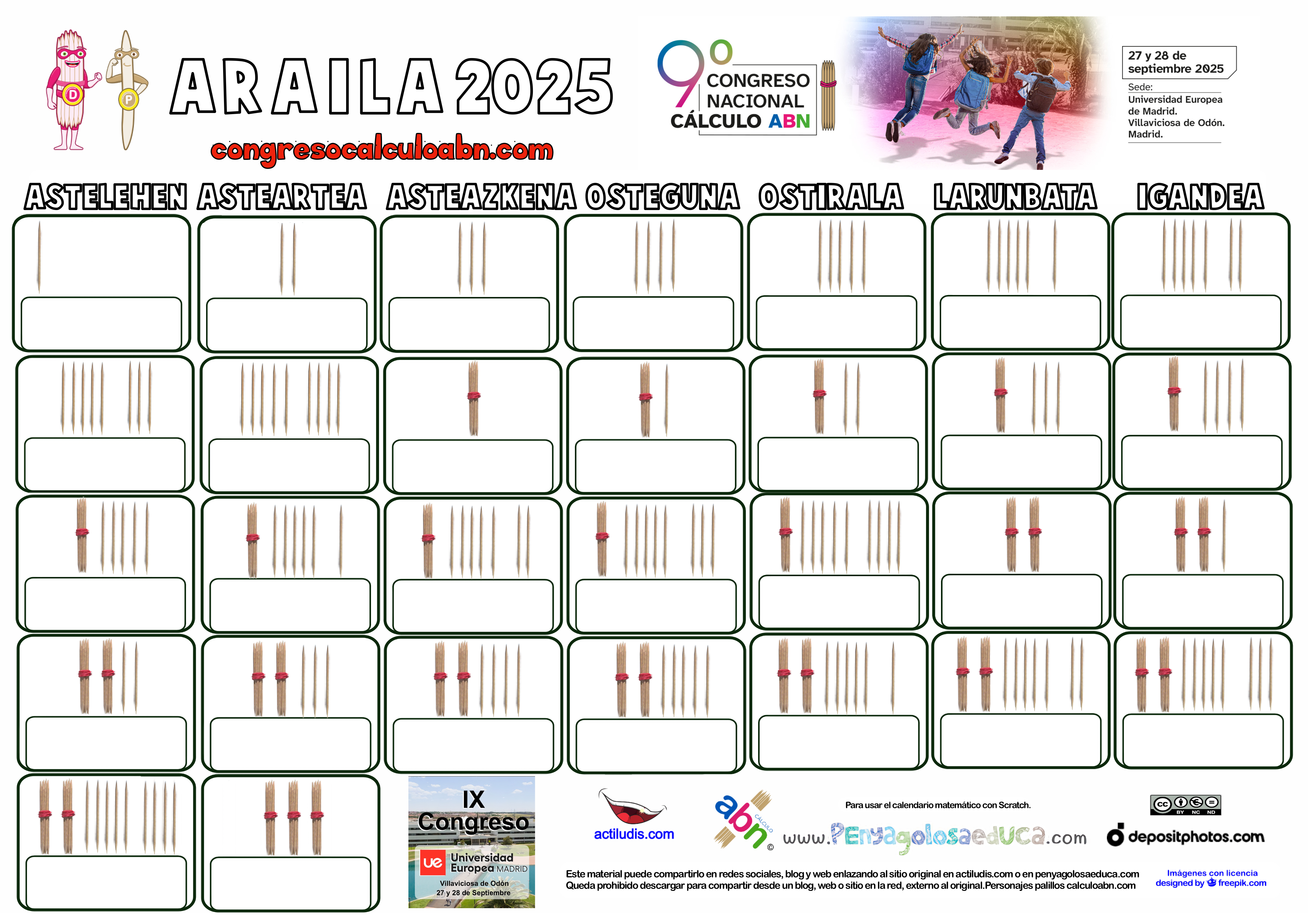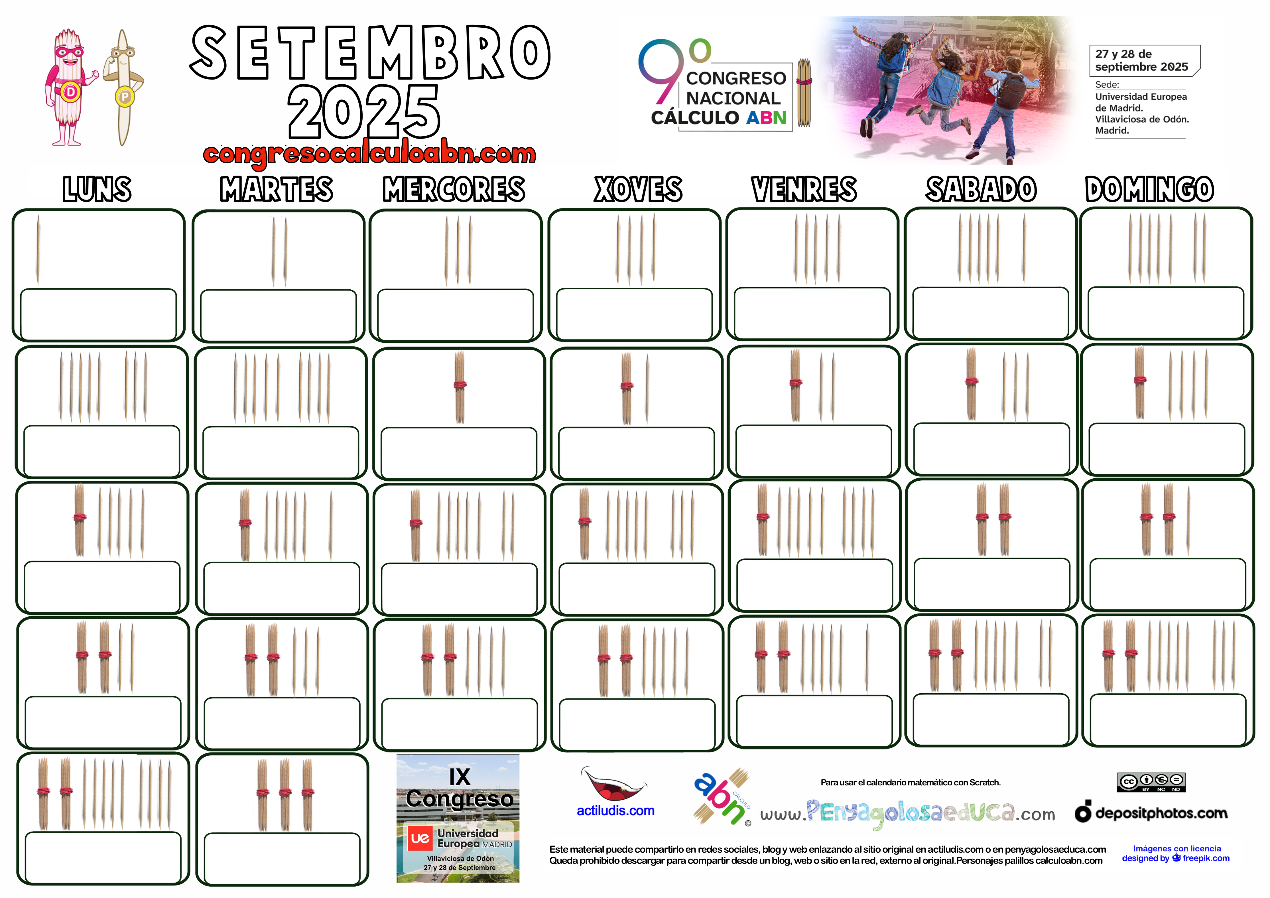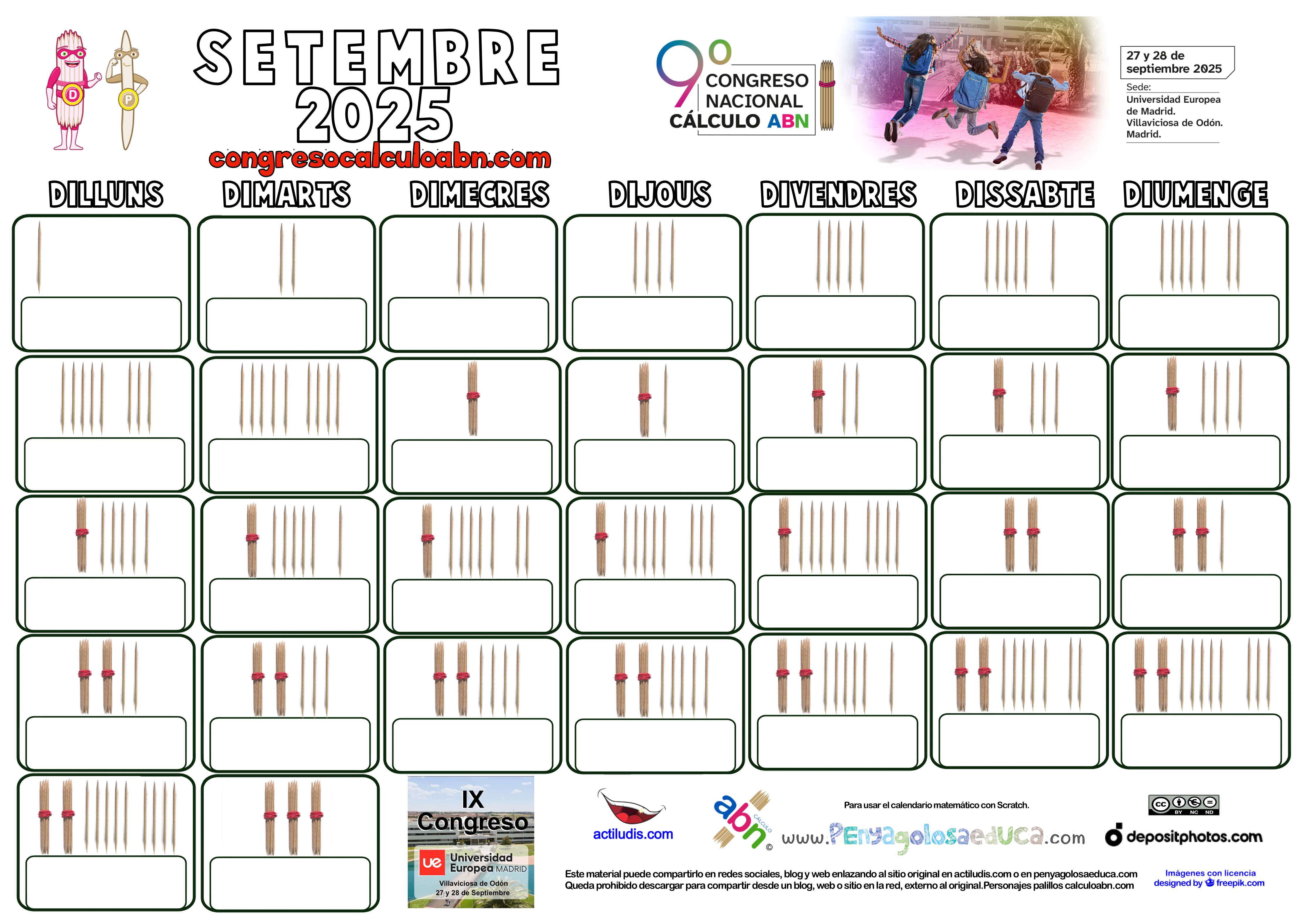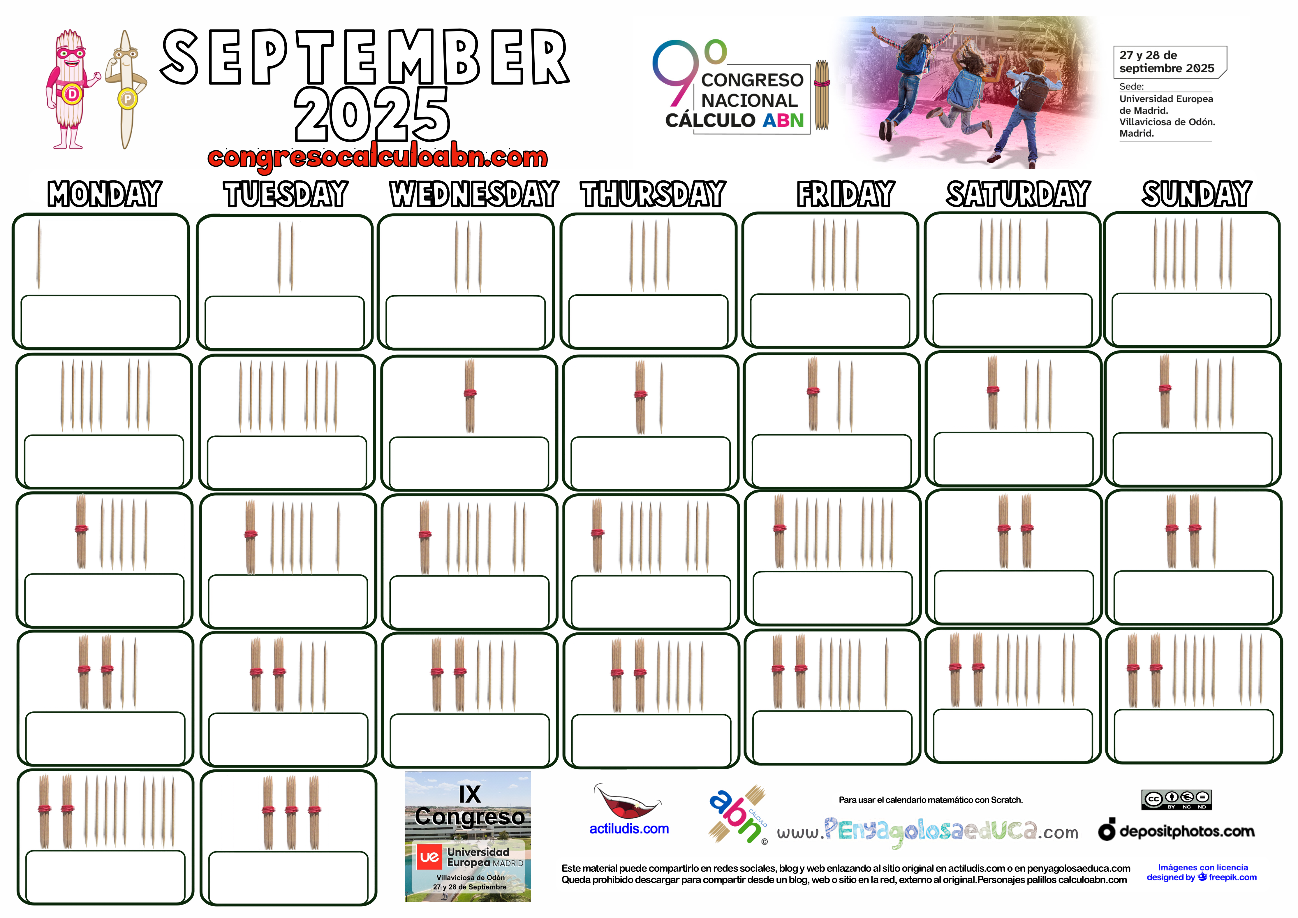Calendario con representación de los días del mes de SEPTIEMBRE de 2025 con palillos. Este material está pensado para Educación Infantil y Primero de Primaria con el que trabajar el calendario. La idea es que el alumnado use el calendario como rutina identificando el día e identificando el número que corresponde con los palillos representados.