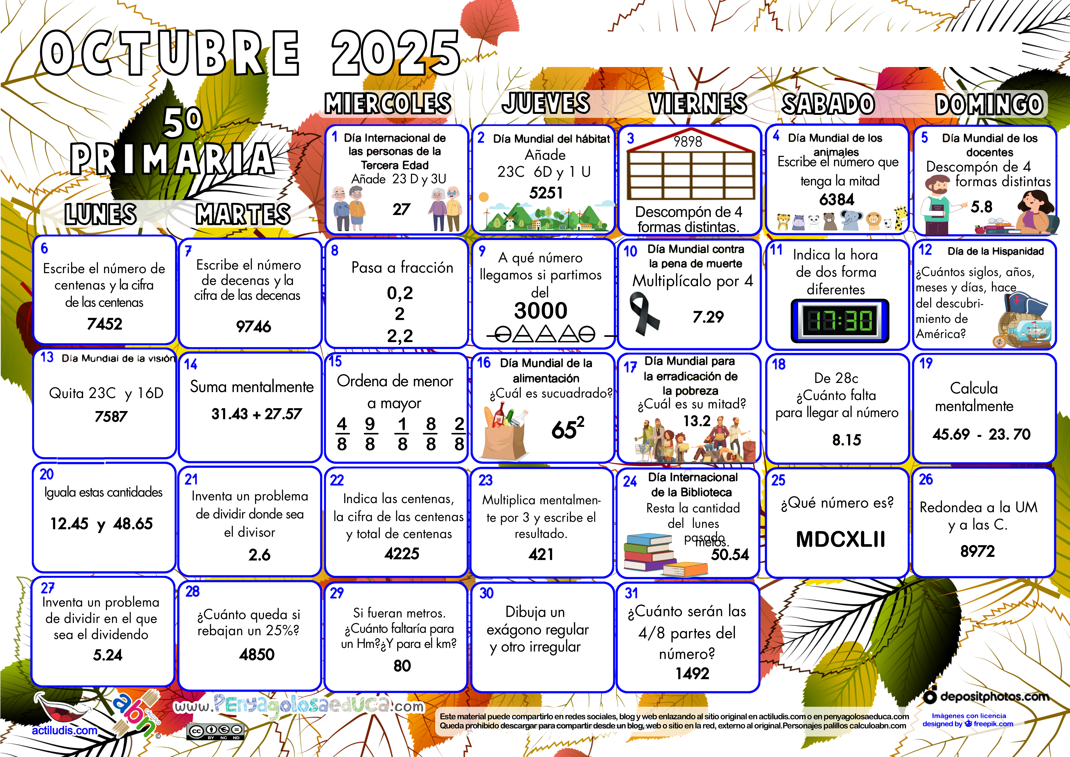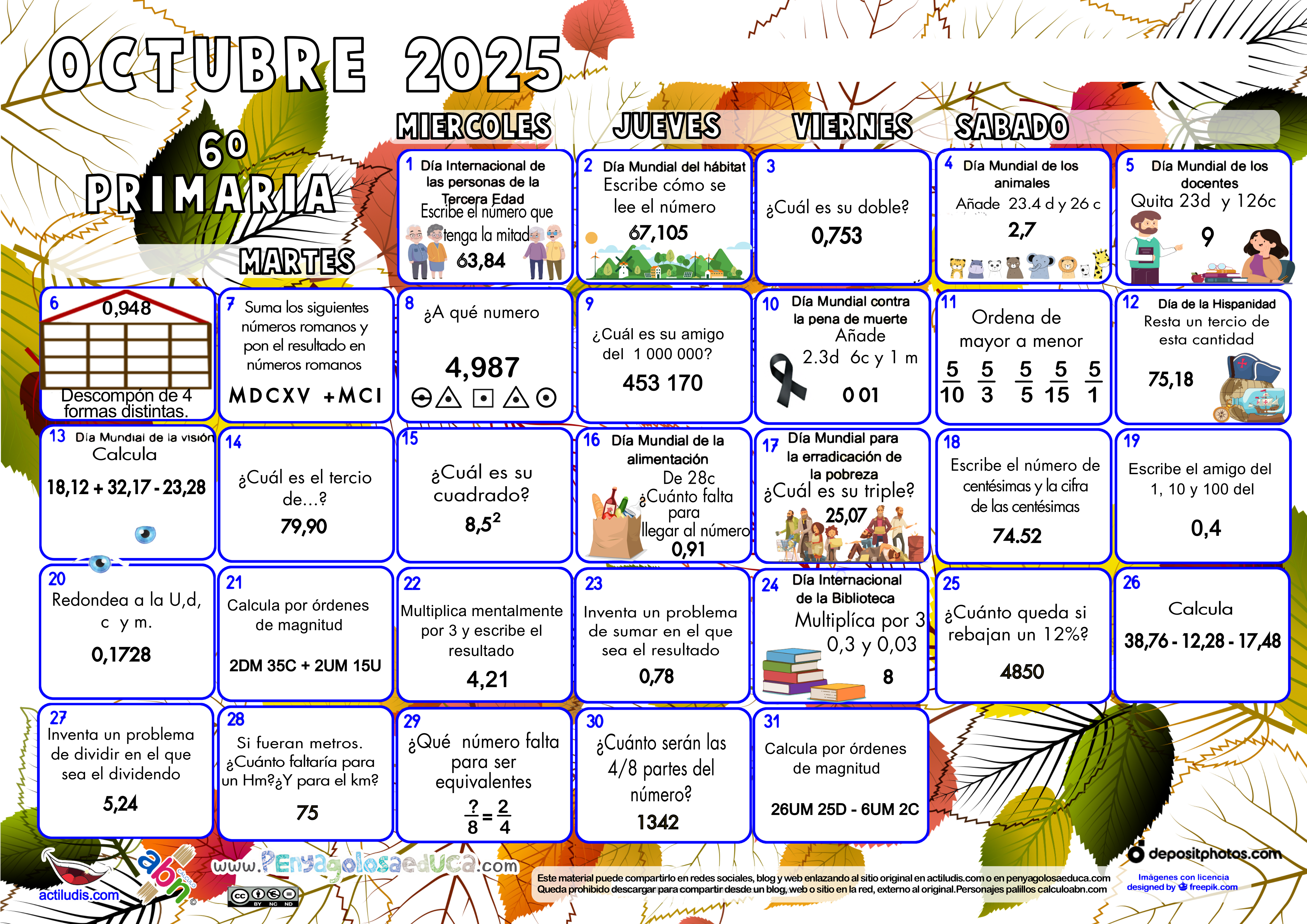 Calendario matemático para el TERCER CICLO de Primaria. OCTUBRE 2025