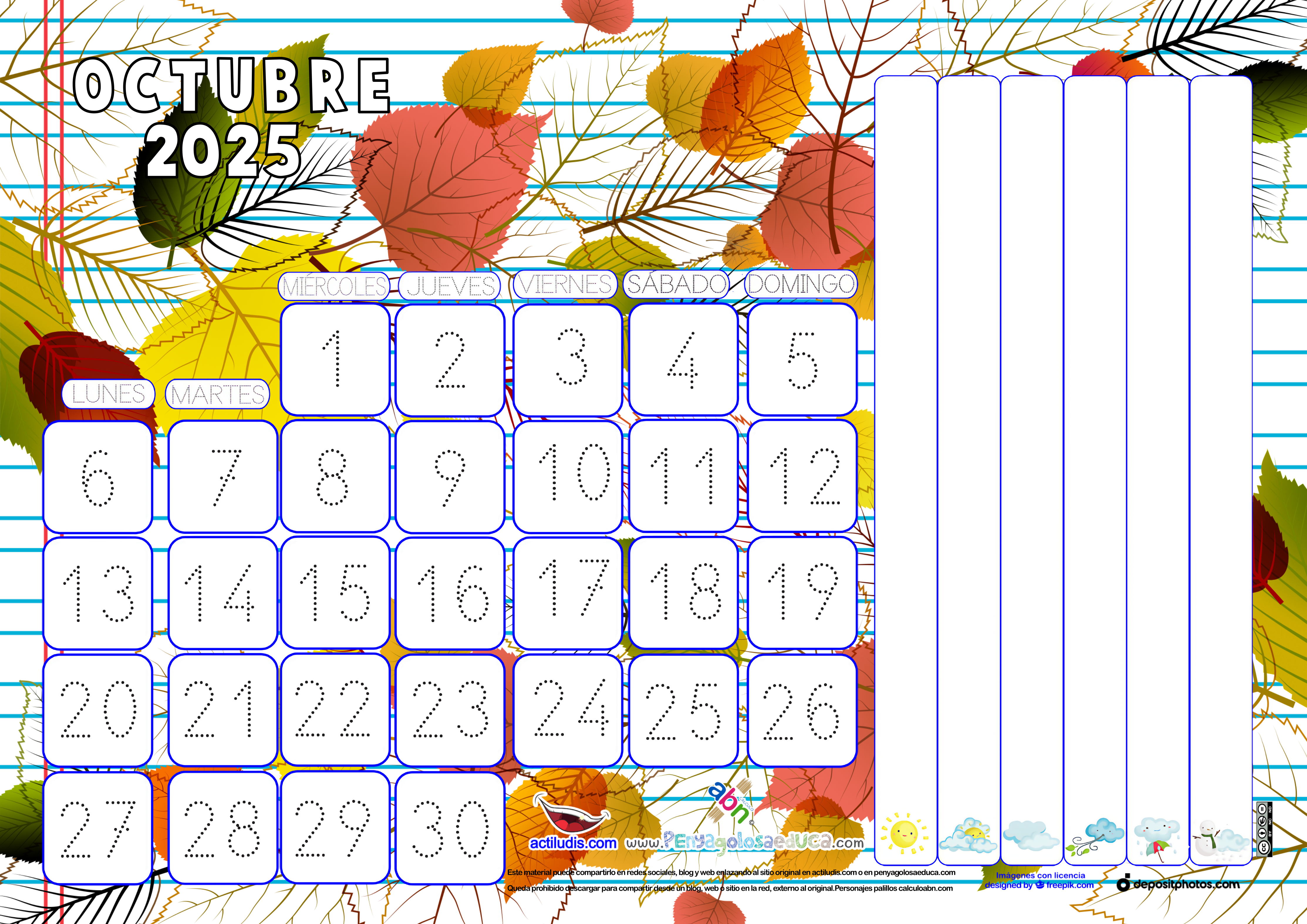 El calendario punteado está disponible en A4 para montar a tamaño mayor, tanto doble como a cuatro A4, para decorar y que se vea bien en toda la clase. Además lo comparto sin color para poder fotocopiar y que el alumnado pueda colorearlo a la vez que va escribiendo los días.