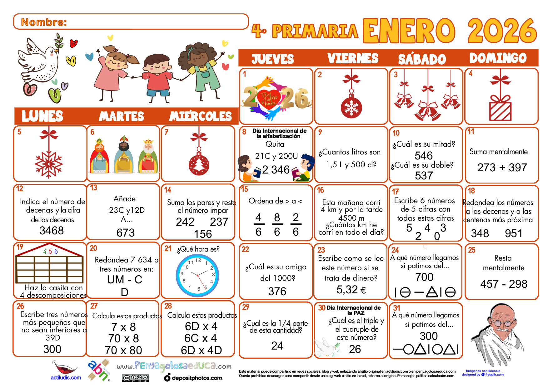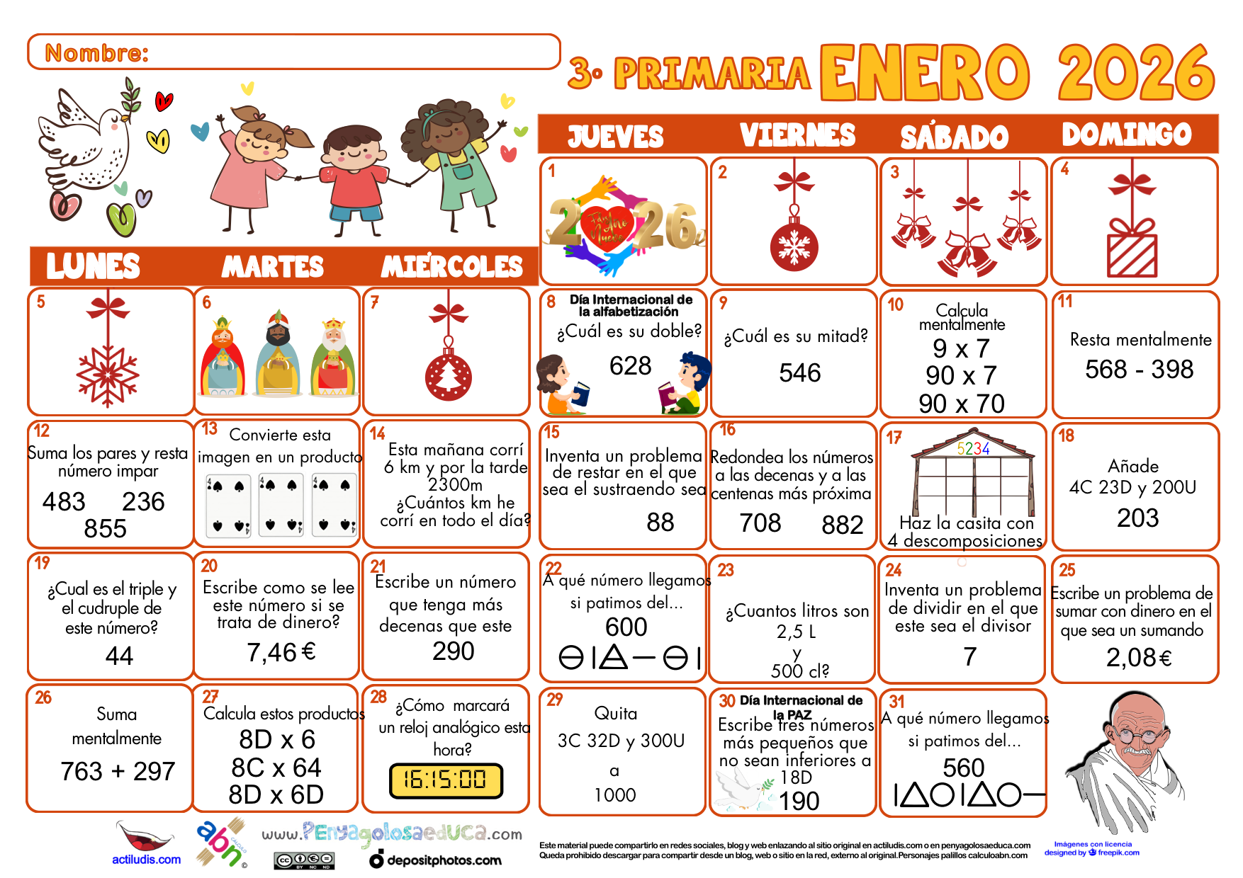 Calendario matemático para el SEGUNDO CICLO de Primaria. ENERO 2026