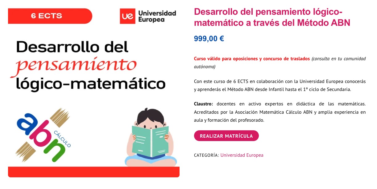 Curso válido para oposiciones y concurso de traslados (consulta en tu comunidad autónoma) Con este curso de 6 ECTS en colaboración con la Universidad Europea conocerás y aprenderás el Método ABN desde Infantil hasta el 1º ciclo de Secundaria. Claustro: docentes en activo expertos en didáctica de las matemáticas. Acreditados por la …