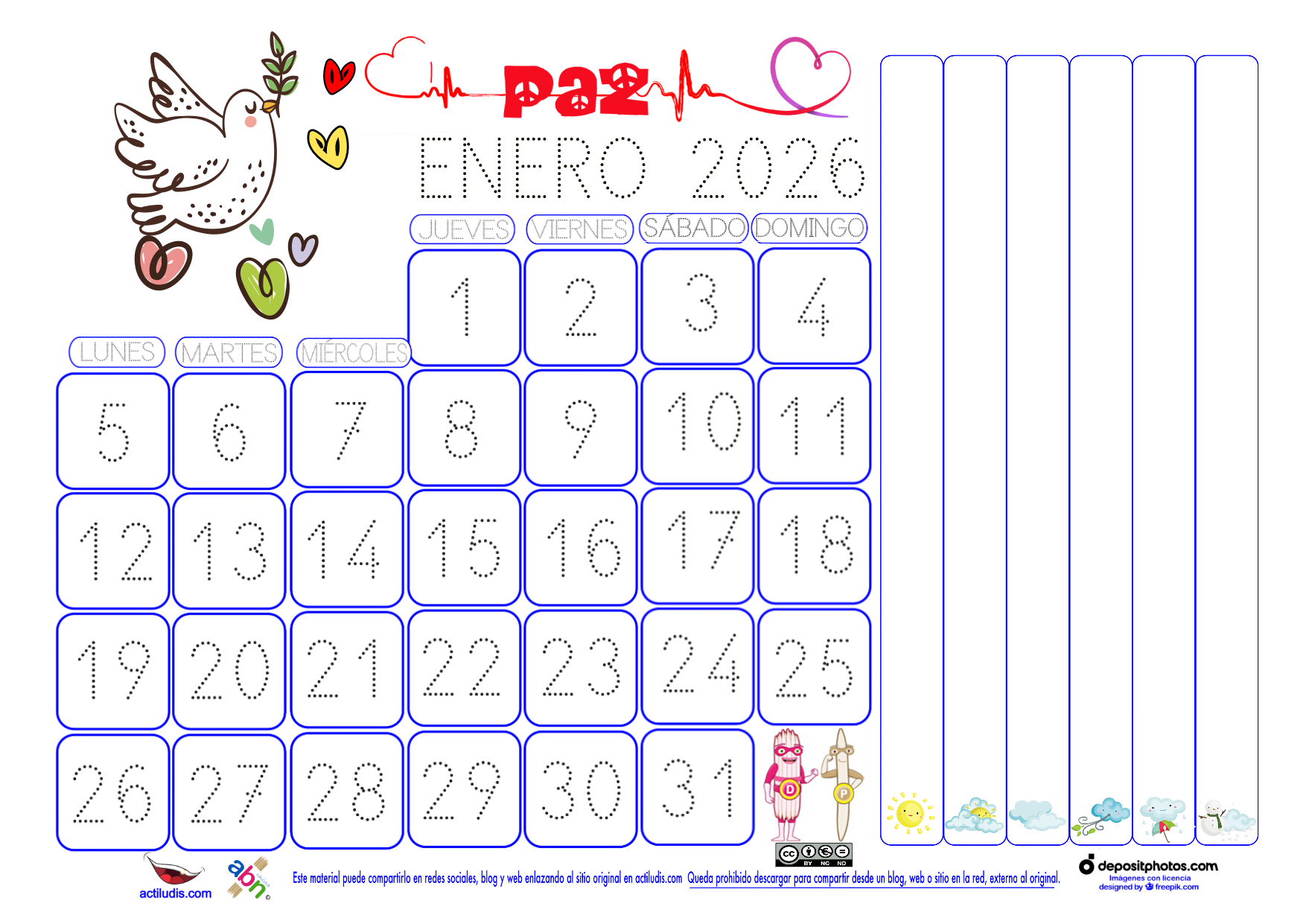 El calendario punteado está disponible en A4 para montar a tamaño mayor, tanto doble como a cuatro A4, para decorar y que se vea bien en toda la clase. Además lo comparto sin color para poder fotocopiar y que el alumnado pueda colorearlo a la vez que va escribiendo los días.