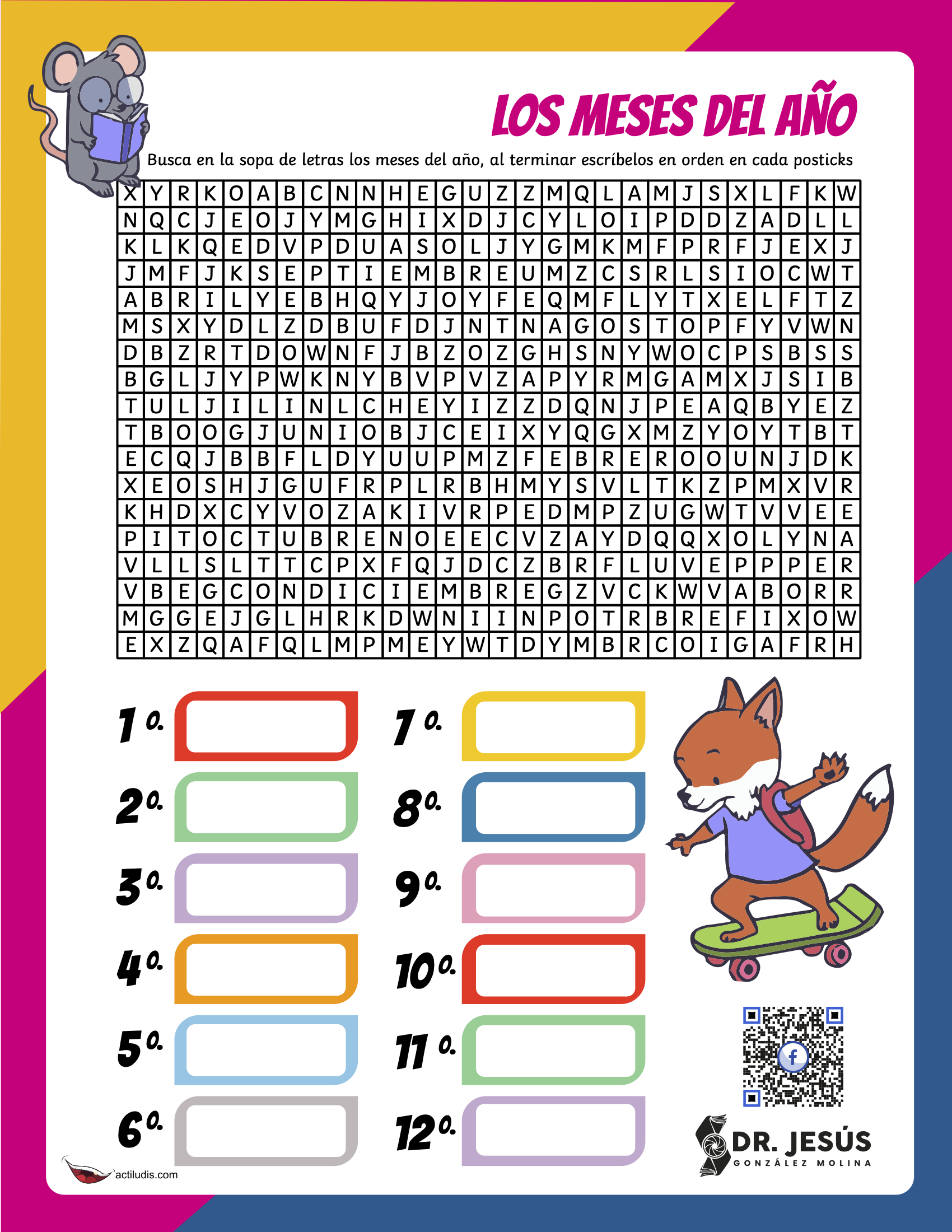 Observa bien la sopa de letras y busca los nombres de los meses. Pueden aparecer en horizontal, vertical o diagonal. Cuando encuentres uno, márcalo en la sopa y escribe su nombre en el orden que le corresponda. ¿Te animas a encontrarlos todos? ¡Manos a la obra!