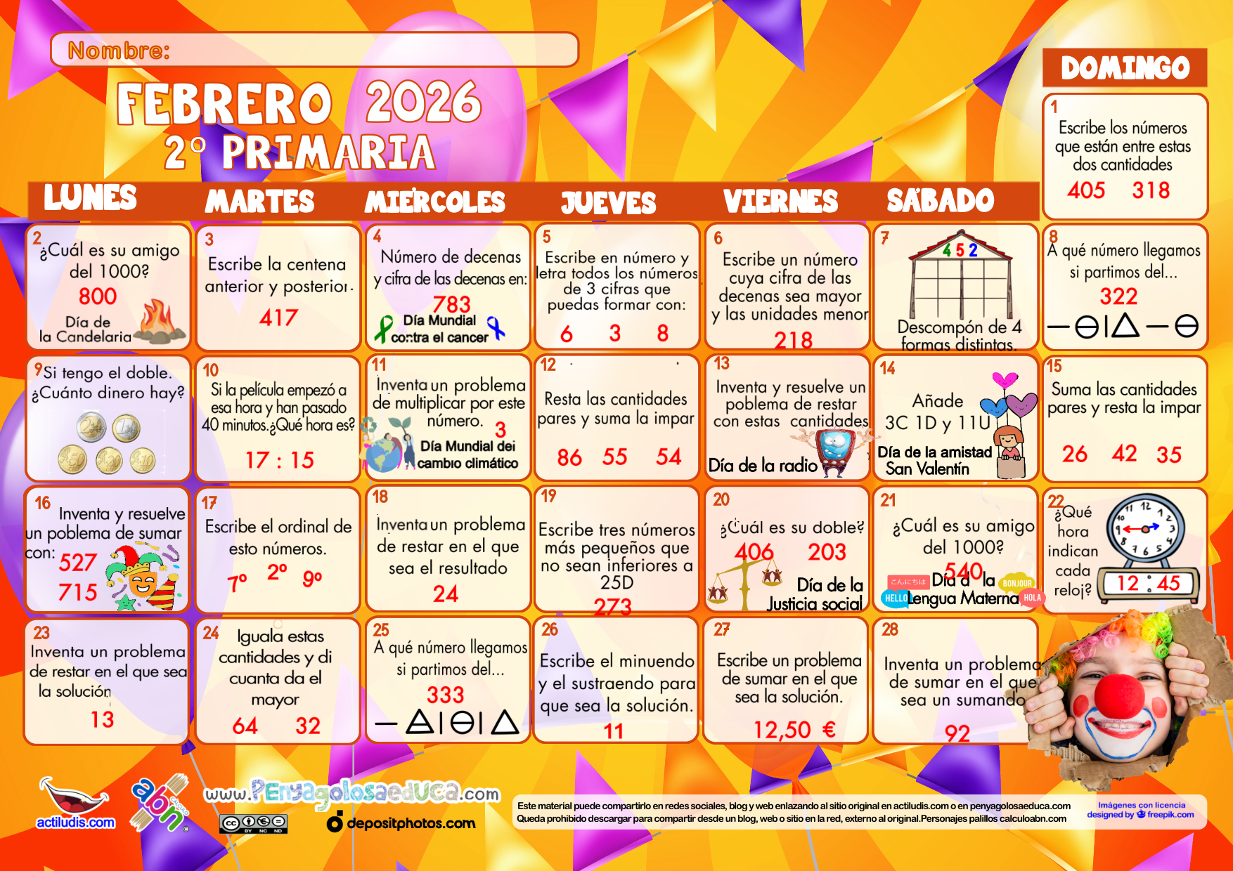 Calendario matemático para el PRIMER CICLO de Primaria. FEBRERO 2026