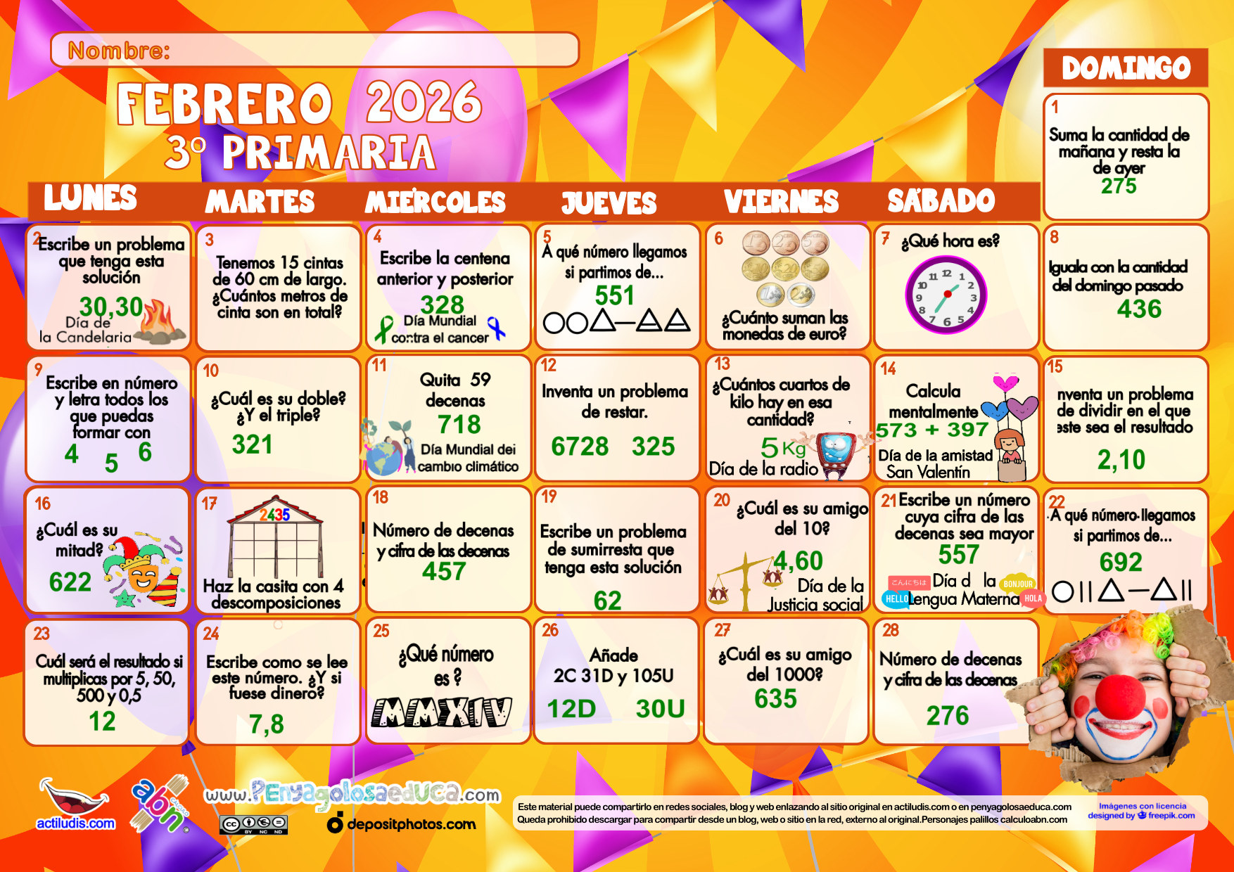 Calendario matemático para el SEGUNDO CICLO de Primaria. FEBRERO 2026