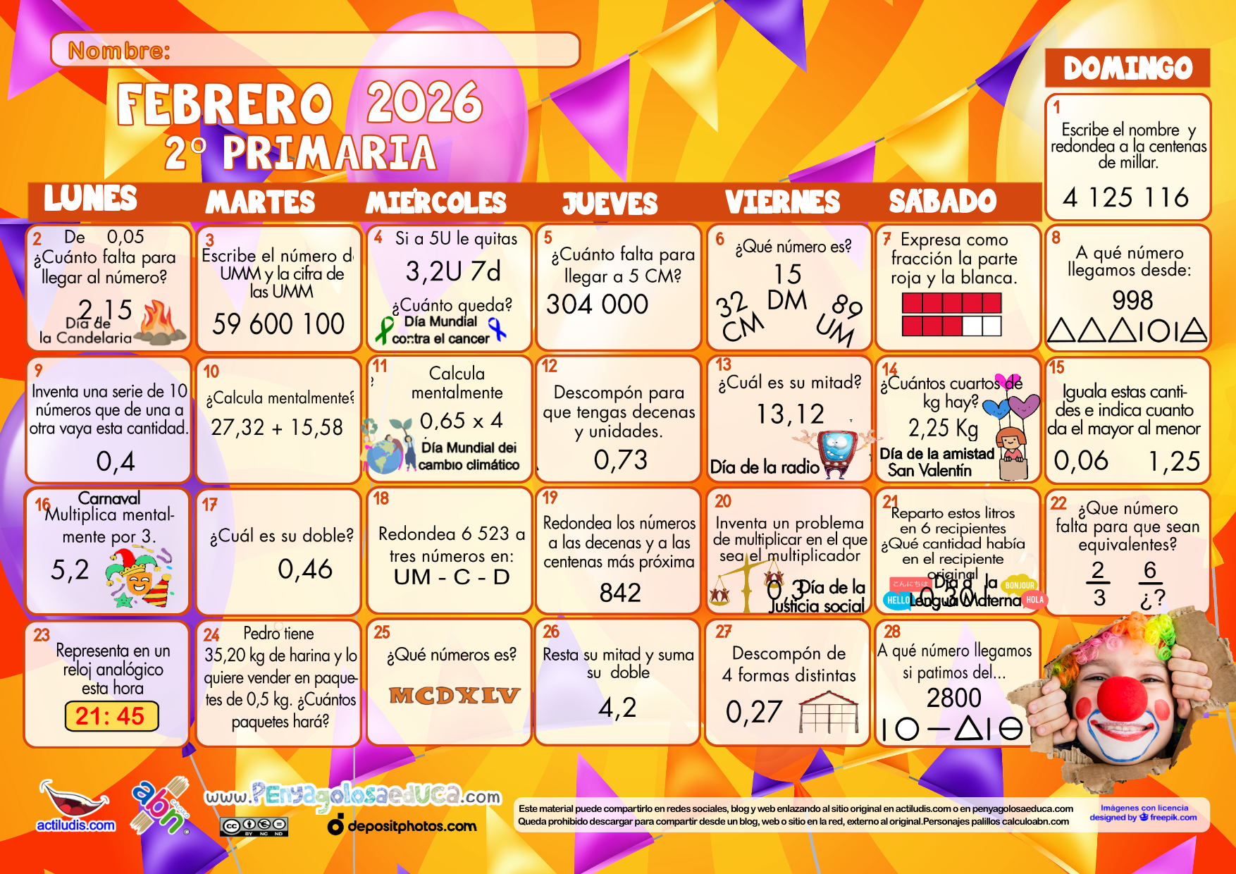 Calendario matemático para el TERCER CICLO de Primaria. FEBRERO 2026