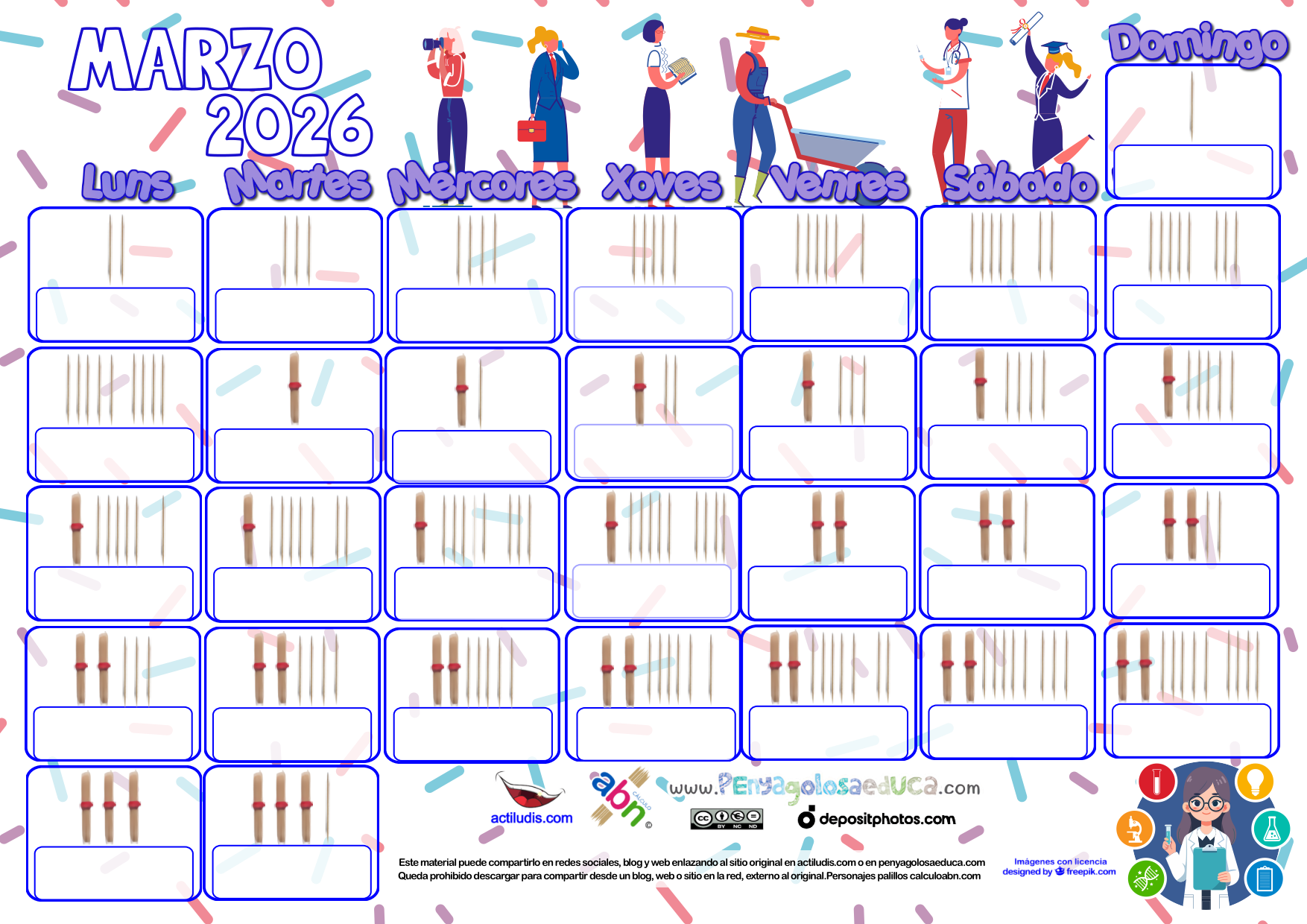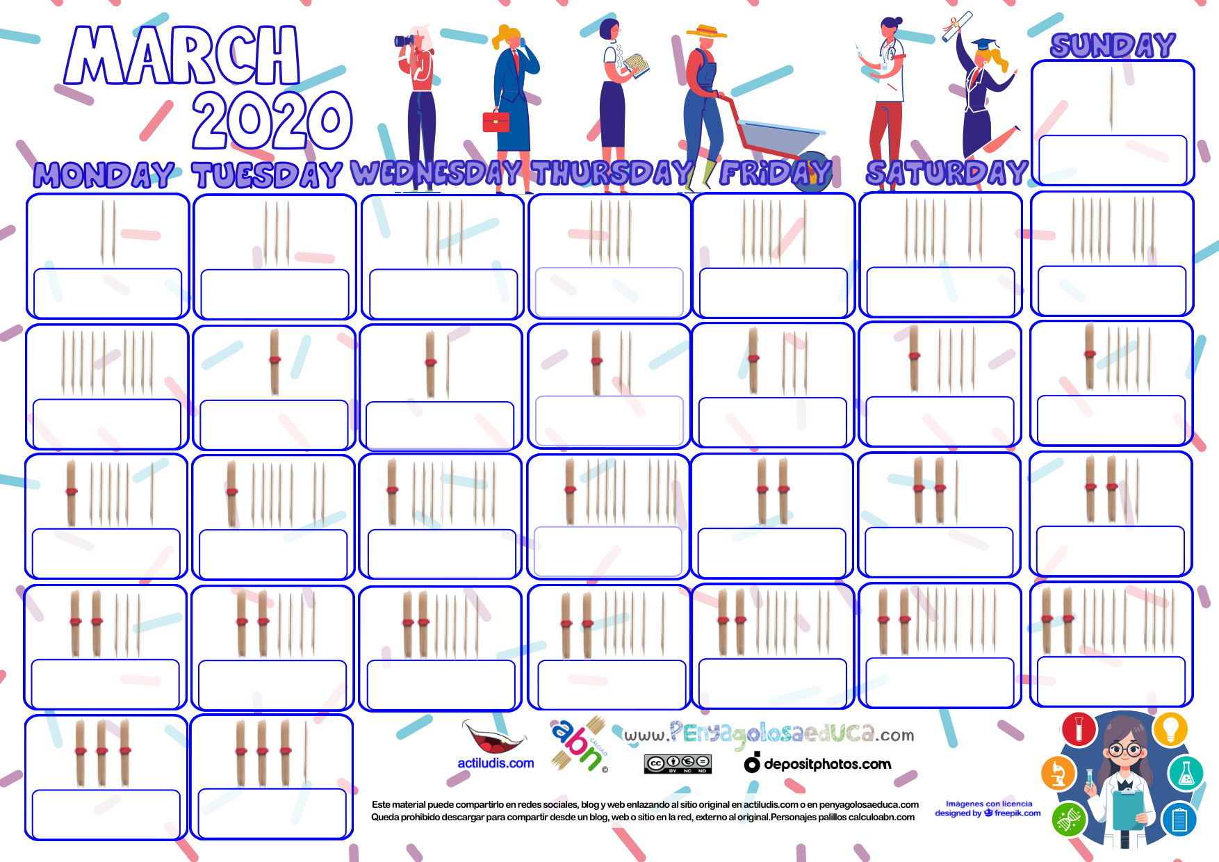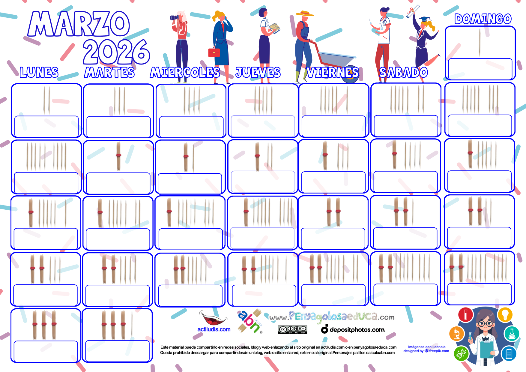 Calendario matemático de palillos mes de MARZO 2026