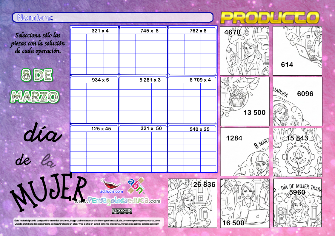 «Producto por la Igualdad» Hoy no solo vamos a practicar matemáticas; vamos a descubrir las piezas de un puzle dedicado a las mujeres que construyen nuestro mundo. La meta es resolver 9 operaciones de productos con números de tres cifras por una y dos (A partir 3º de Primaria)para encontrar …