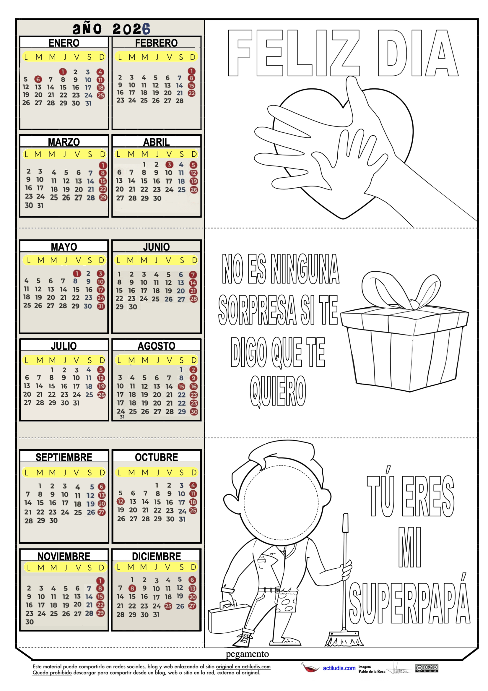 Además de colorear los dibujos del calendario ehmos incluido la figura de un «Superpapá» vestido mitad y mitad con ropa de trabajo y ropa de casa. Además hemos dejado un círculo en el centro para, bien dibujar la cara o pegar la foto de papá.