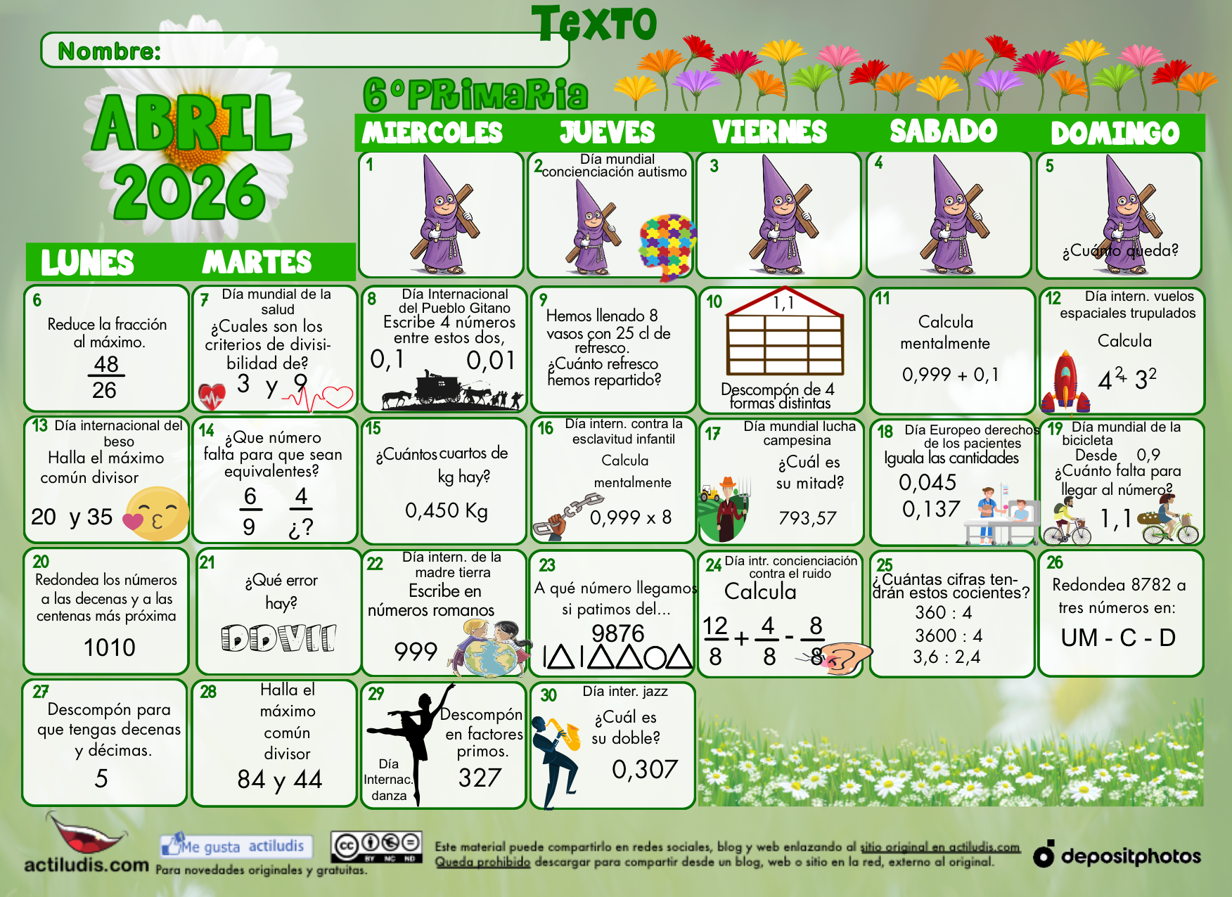 Calendario matemático para el TERCER CICLO de Primaria. ABRIL 2026