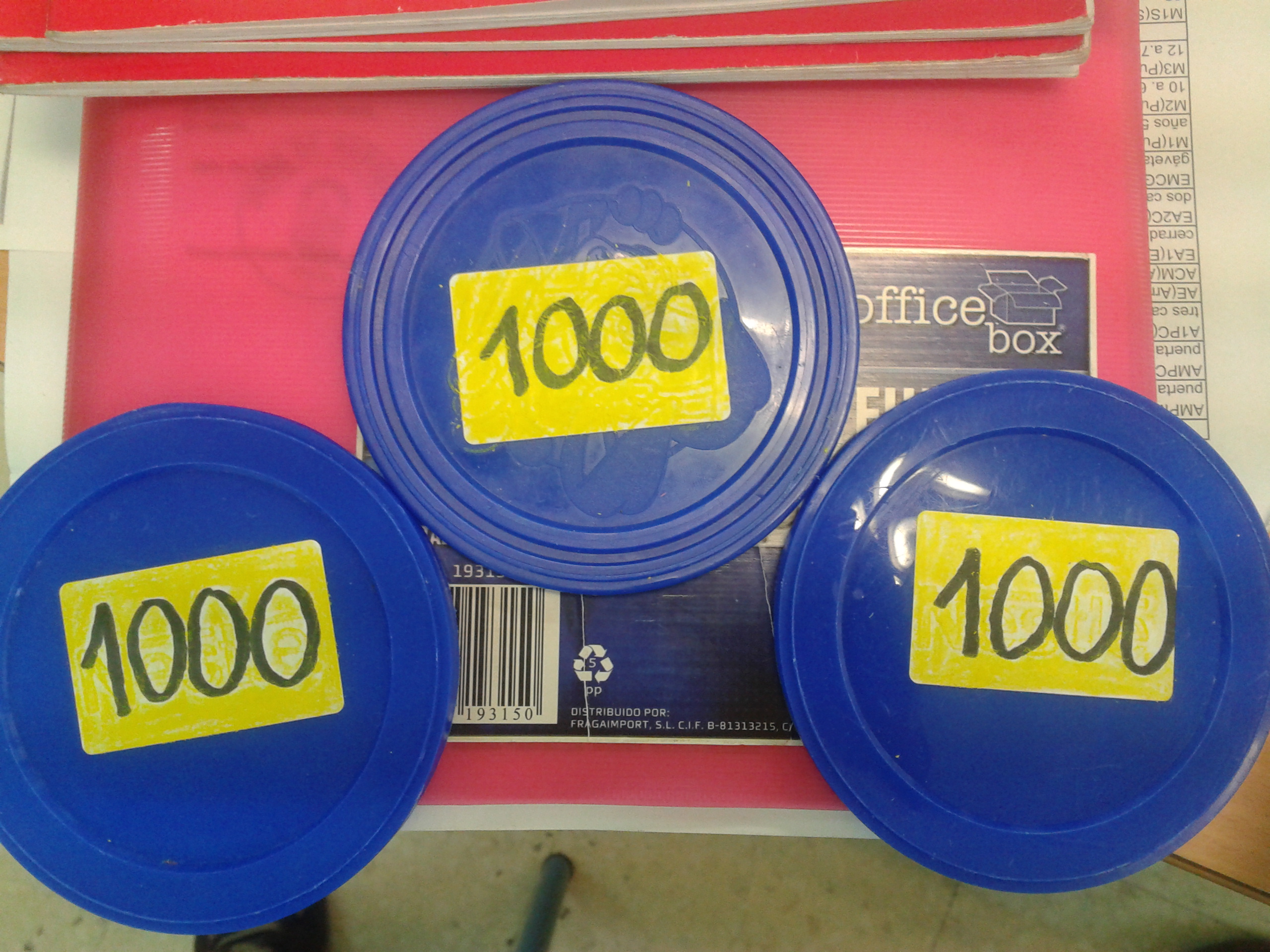 May Trillo maestra en el “CEIP Averroes” de Córdoba, como están trabajando las unidades de millar en segundo y aún algun@s alumn@s necesitan un primer paso de manipulación física, han creado sus propias unidades de millar con tapaderas de productos lácteos. En las fotos Mara enseña cómo ha representado el 2246 con palillos …