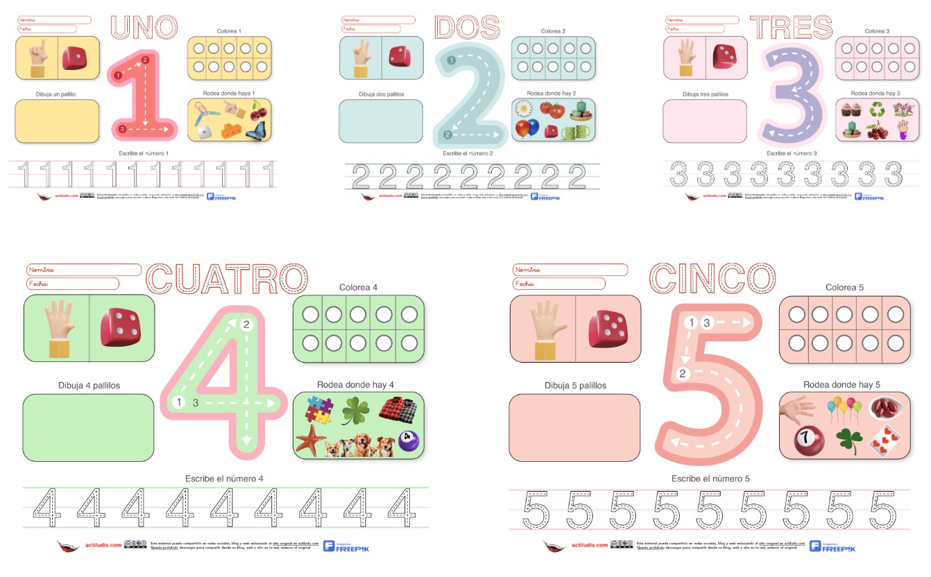 Cinco fichas para el aprendizaje de la grafía, el cardinal y el sentido numérico del uno al cinco. Además de practicar la grafía, se presenta el número de diferentes formas, se le pide que pinte en el tenframe la cantidad concreta, pinten tanto palillos como sea el cardinal del número …