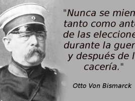 «Nunca se miente tanto como antes de las elecciones, durante la guerra y después de la cacería.» Otto Von Bismark Otto Eduard Leopold de Bismarck-Schönhausen, príncipe de Bismarck y duque de Lauenburgo (Schönhausen 1815 – Friedrichsruh 1898), más conocido como Otto von Bismarck apodado el «Canciller de Hierro» fue un estadista y político alemán, artífice de la unificación …