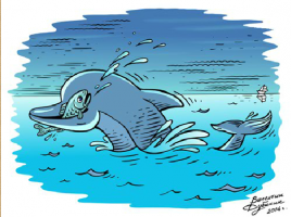Esta imagen titulada «Delfín y pez» es del humorista gráfico y caricaturista ruso Valentin Dubinin, en ella nos muestra un delfín con un pez en la boca. Los delfines como mamíferos empiezan su vida tomando la leche de la madre, pero su boca con el tiempo se puebla de afilados dientes …